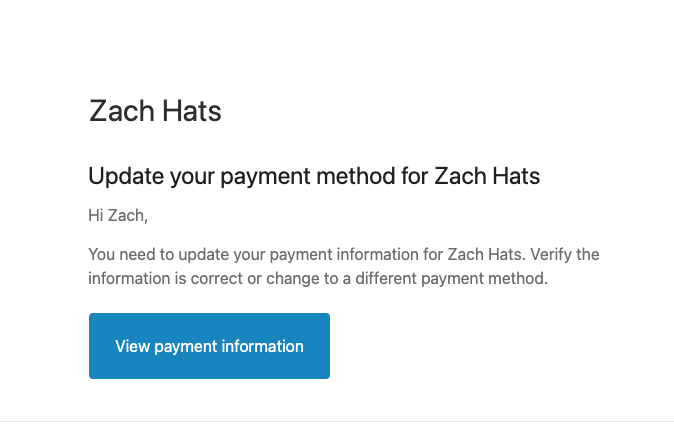 If a shopper's payment fails, they will receive an email from Shopify to update their card details. Here is what that email looks like for our test store called Zach Hats: